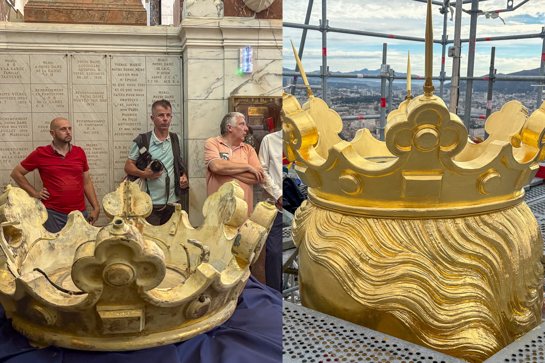 Depuis le mois d’août, la statue était enveloppée d’une bâche thermo-soudée, transformant les échafaudages en véritable atelier suspendu à 220 mètres de hauteur. Un espace protégé du mistral et des embruns, où les doreuses ont pu travailler dans des conditions inédites. « C’est la septième dorure de la Bonne Mère depuis son installation au XIXᵉ siècle. La précédente datait de 1989 », rappelle l’architecte.