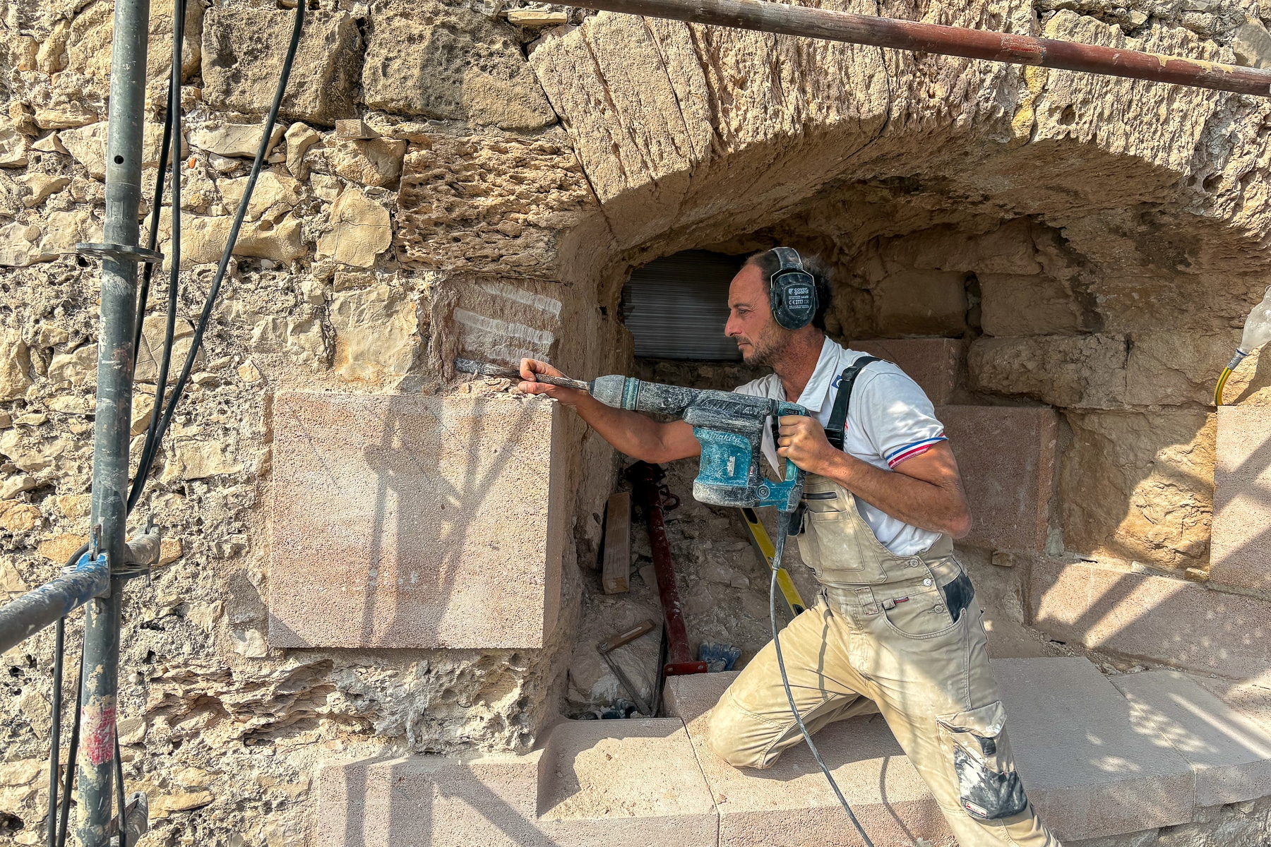 12 m3 de pierre, soit 27 tonnes, ont été taillés en blocs sur mesure dans l’atelier de Vivian & Cie, puis héliportés jusqu’à l’île pour remplacer celle d’origine. « On retire une pierre ancienne, on la remplace, puis on injecte un mortier liquide pour combler les cavités et renforcer la structure, détaille Olivier Maillet. Après ça, on a un délai de séchage de deux jours avant de basculer sur la suivante, puis la suivante… ».