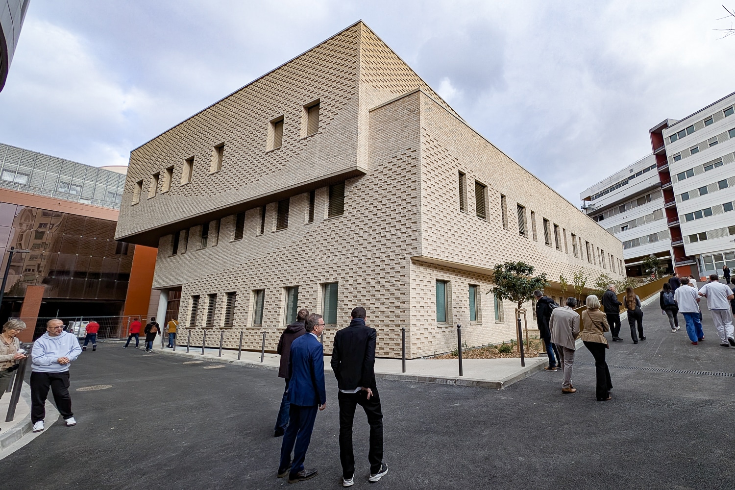 L’agence AIA Architectes a dessiné ce nouveau bâtiment de 5 niveaux, en l’habillant d’un parement de briques de terre cuite. Il accueille les activités de chirurgie cardiaque, cardiologie, celles de l’Institut du thorax, ainsi que d’ophtalmologie, notamment pour les enfants.