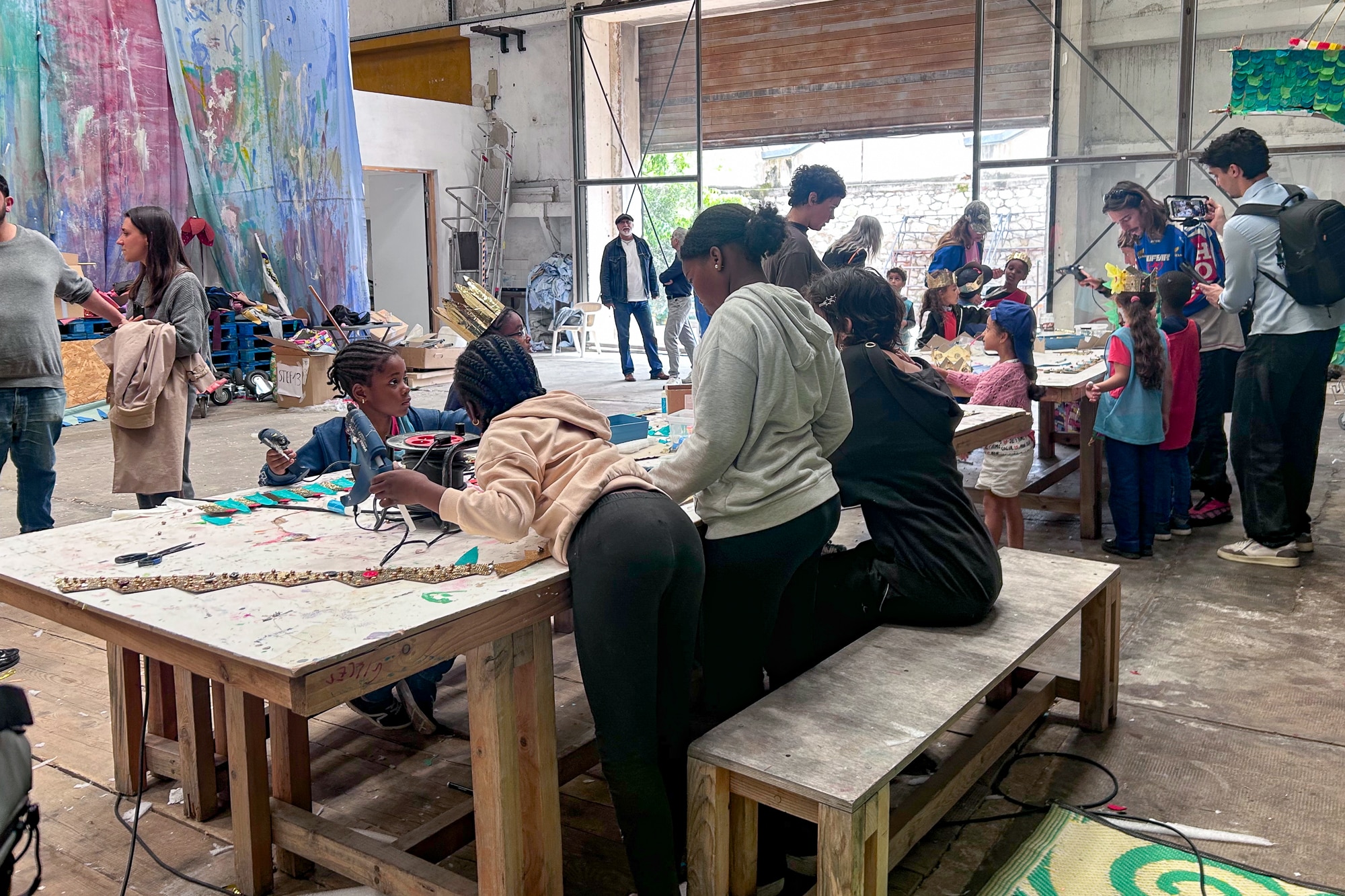 Dans la salle, les idées prennent forment au fil des essais. Nya et Lina, 9 ans passent d’un atelier à l’autre. Elles montrent leurs réalisations, corrigent, ajoutent des détails. « Là, on a fait un dragon », explique Nya en désignant une structure géante montée à plusieurs, déjà peinte de vert et décorée d’écailles. À coté, Lina décore une couronne de perles et de bouchons en plastique.