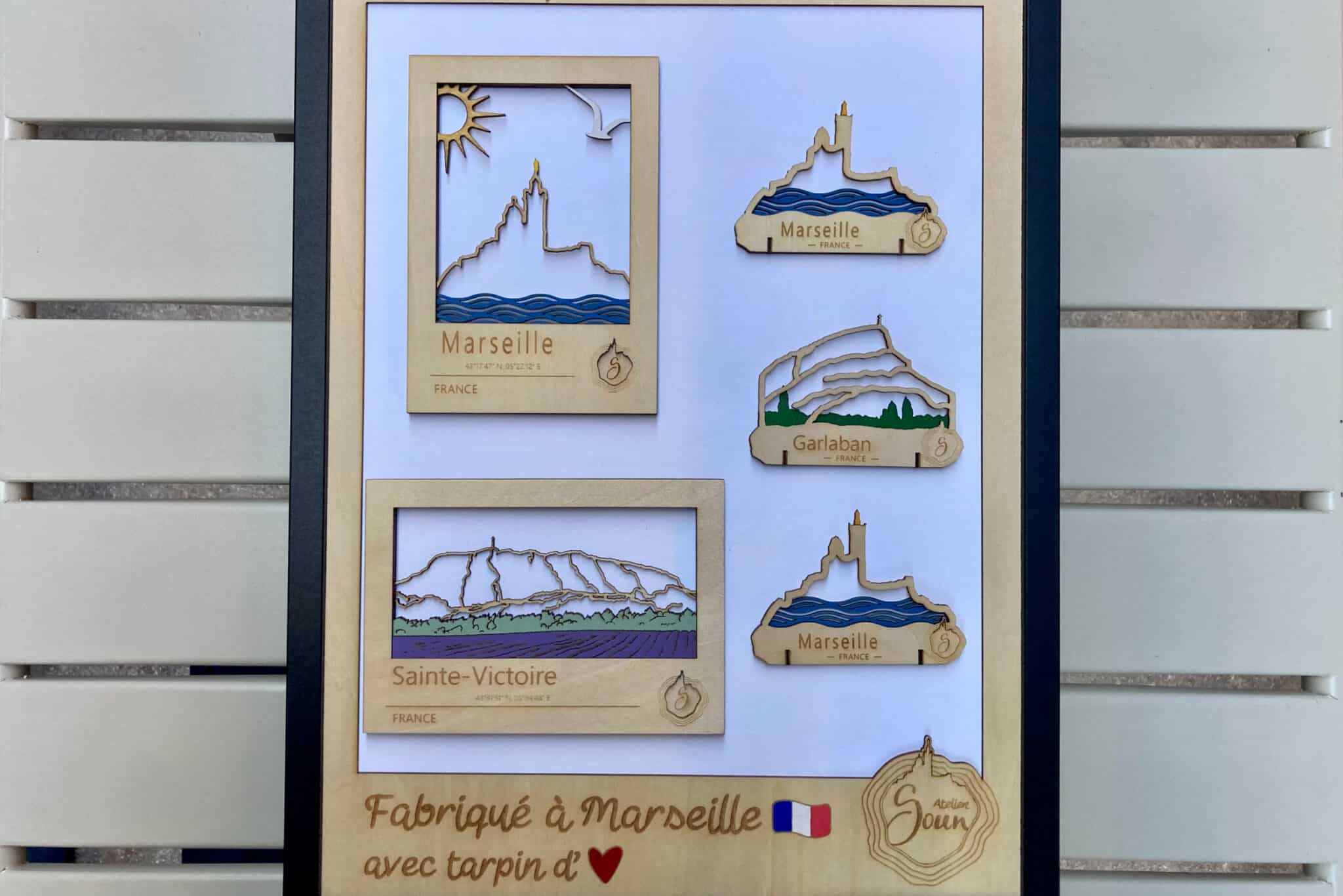 Installé depuis un an à Marseille, l’Atelier Soun s’est fait une place discrète mais remarquée dans le paysage artisanal local. Ici, le bois se découpe au laser pour donner vie à des lieux familiers : la Bonne Mère, le Garlaban, la Sainte-Victoire… autant de paysages emblématiques que Soun « sculpte » et assemble avec minutie.