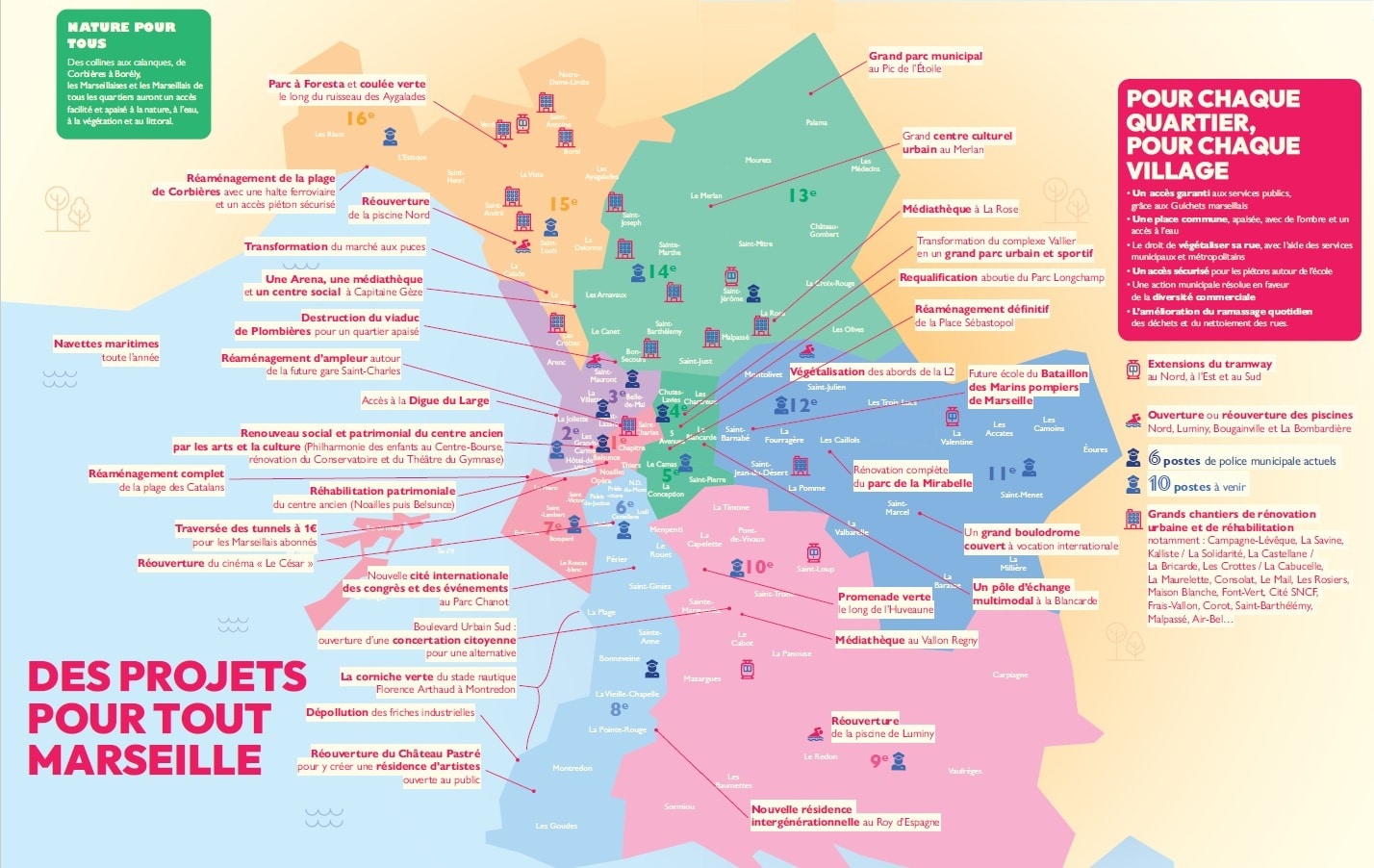 Au-delà du réaménagement complet des Catalans qui devait être réalisé sous le mandat, on y retrouve le « cheminement et la découverte de l’Anse du Pharo » que devait réaliser la Soleam. Mais aussi « l’accès renouvelé à la Digue du large, l’agrandissement des plages du Nord et du Sud, la création d’un nouveau parc balnéaire à l’Estaque ». Sur ce dernier point, il peut s’agir du quai de la Lave.
