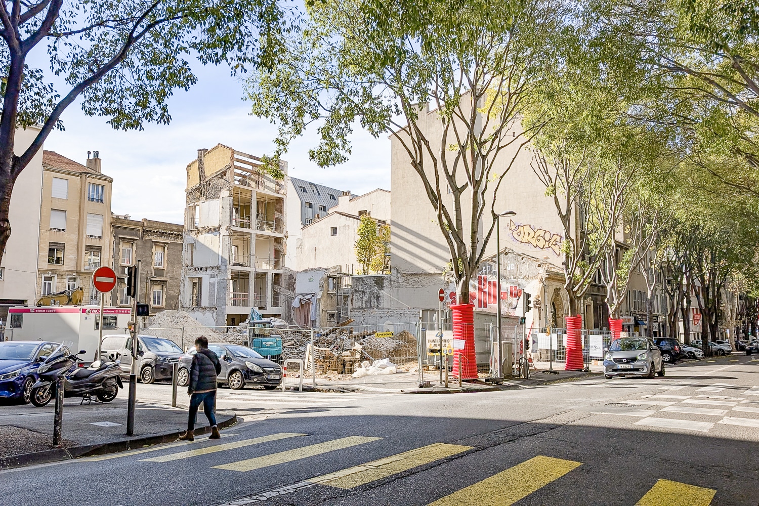 Nous sommes à deux pas de la place Castellane, aux numéros 34 et 36 du cours Gouffé. Les deux immeubles à l’abandon depuis des années sont tombés. Parmi les gravats qui jonche la parcelle d’environ 1 000 m2, seules restent debout les portes cochères d’époque sur le cours, et la façade et deux murs d’un immeuble évidé côté avenue de Toulon.